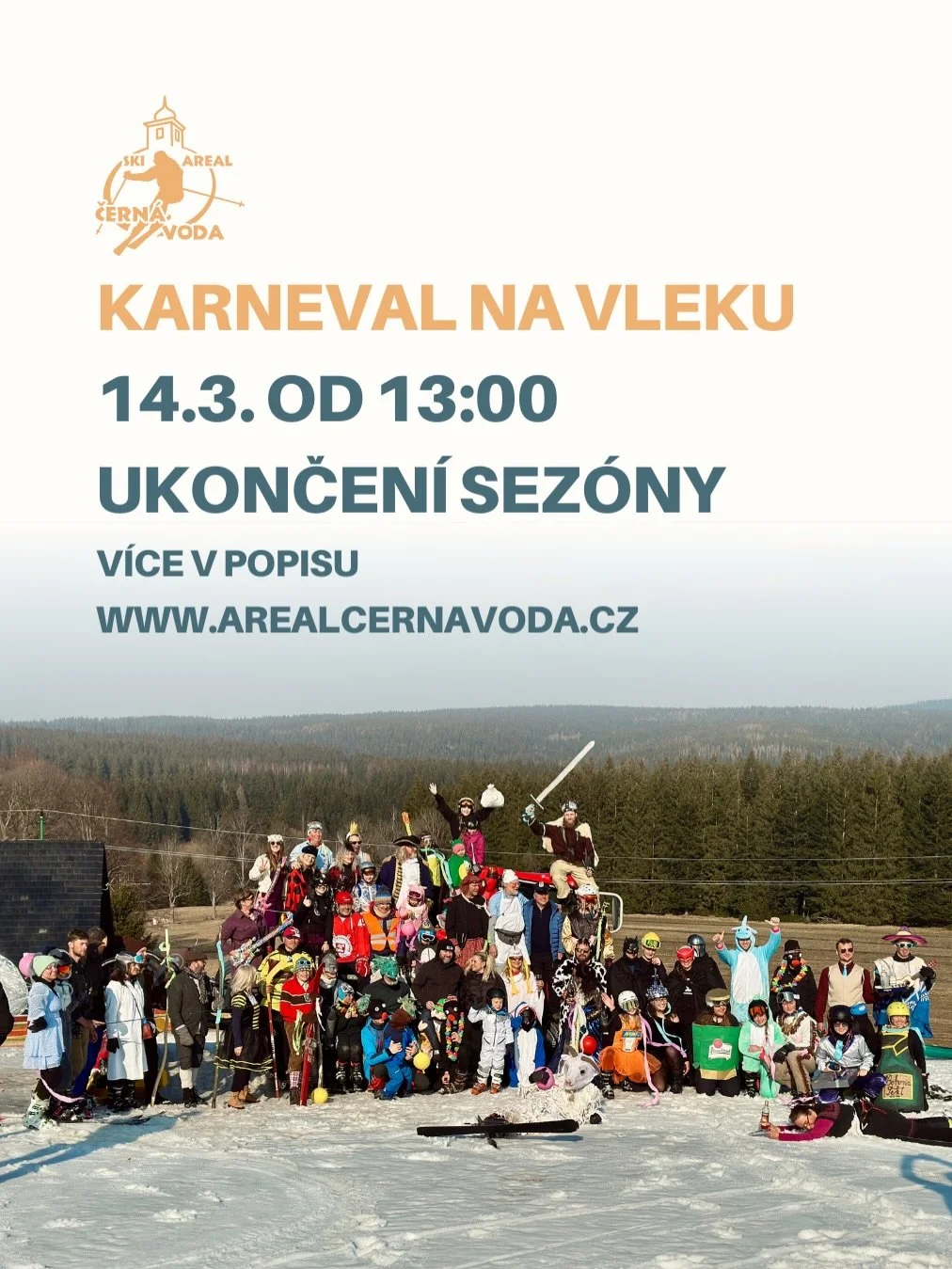 V sobotu 14. 3. 2026 od 13:00 to na vleku rozjedeme ve velkém stylu – karneval na vleku jako zakončení zimní sezóny 2025/26! 🏂